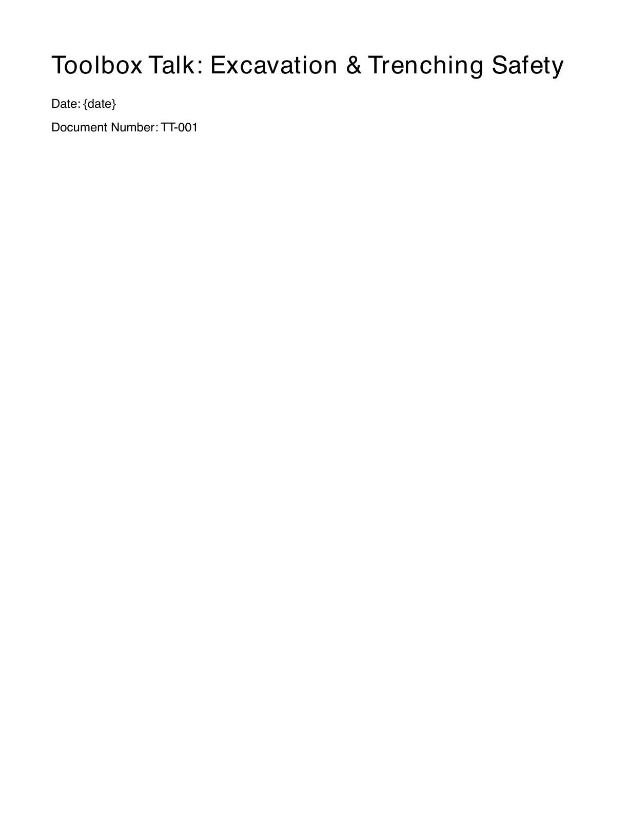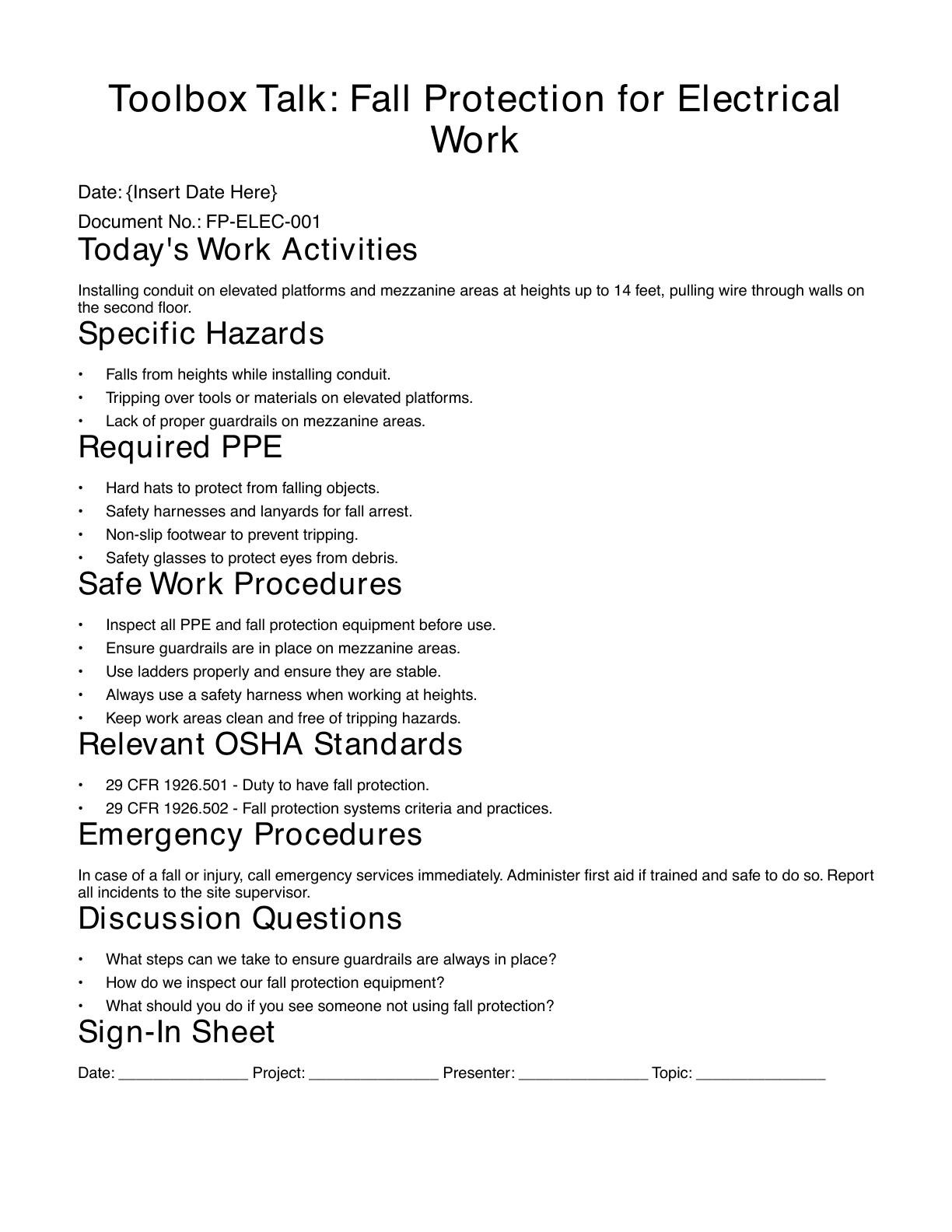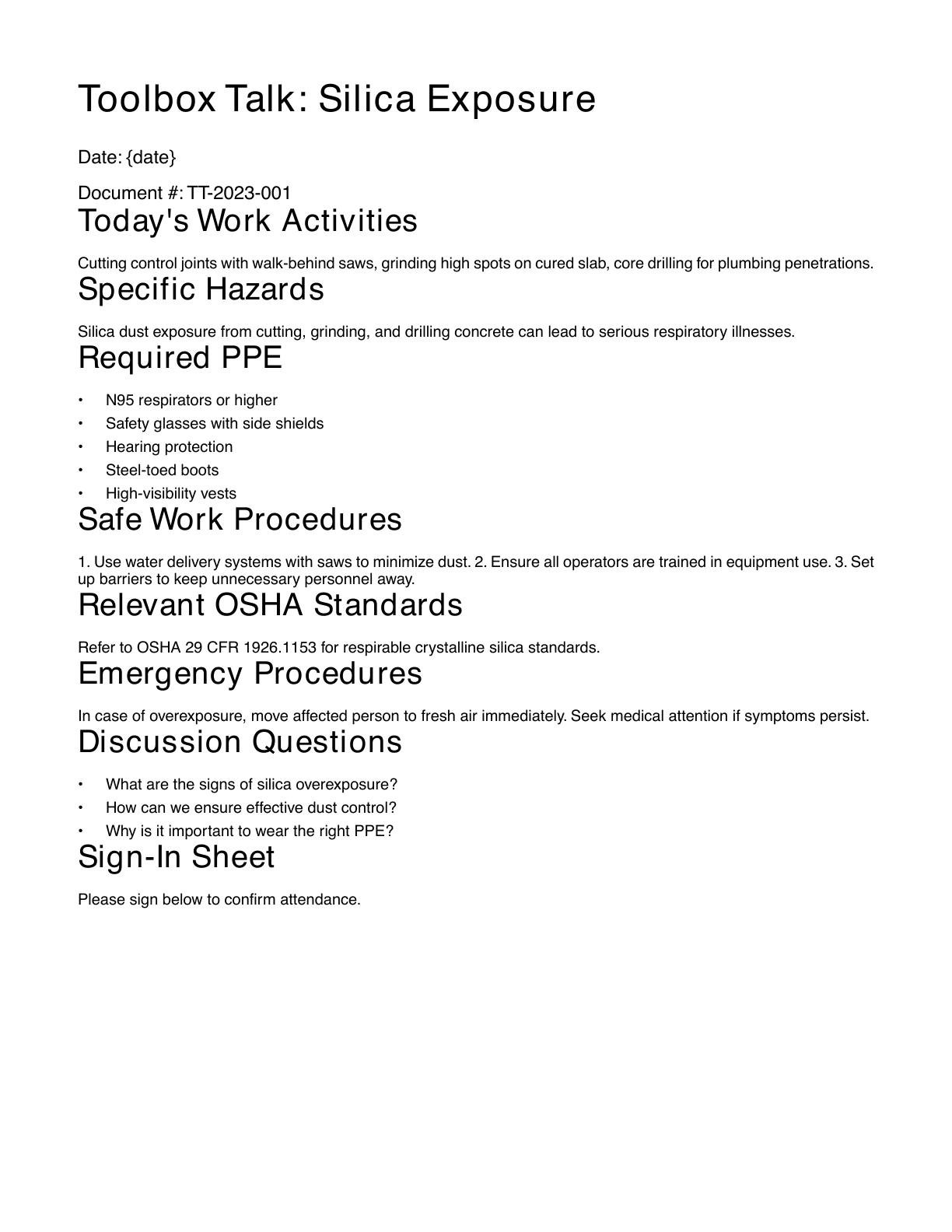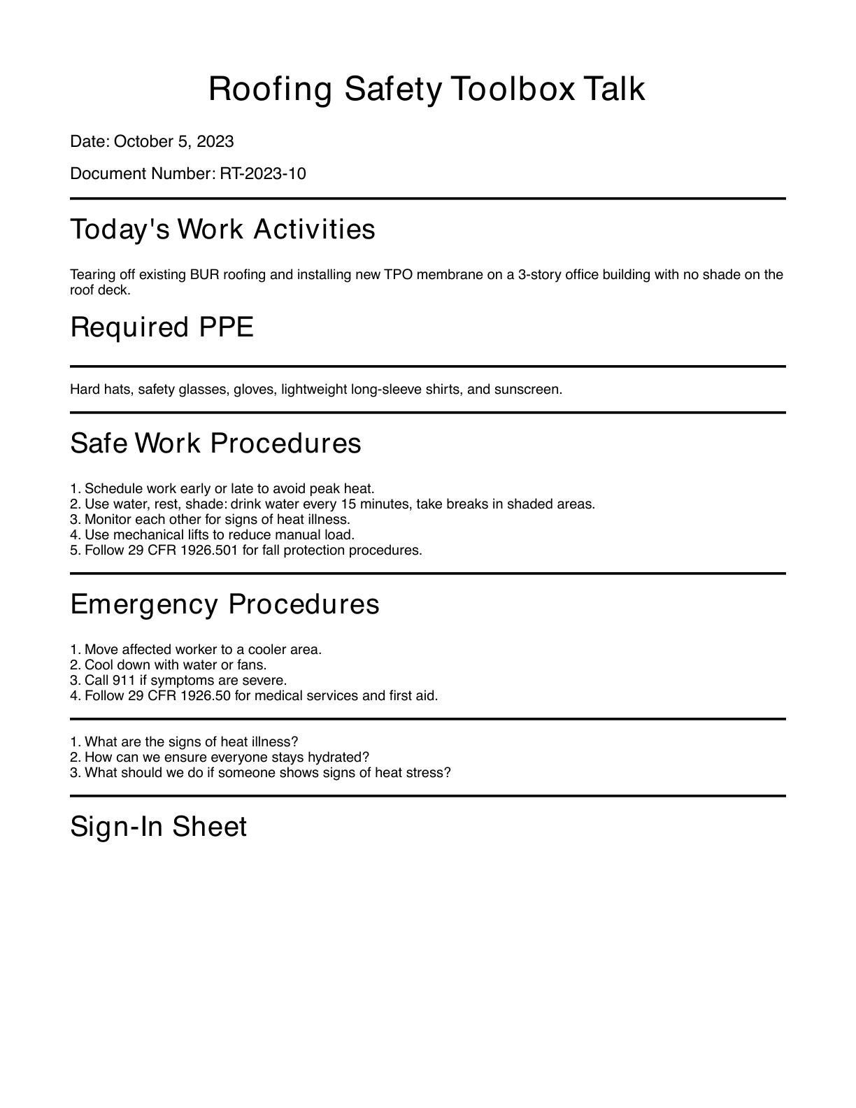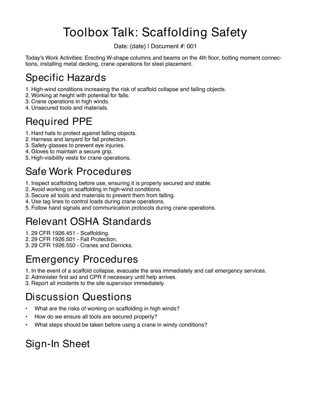 Erstellen Sie ein 5–10-minütiges Sicherheitsgespräch, maßgeschneidert auf die heutigen Arbeitsaktivitäten, Ihren spezifischen Handwerksberuf und die aktuellen Wetterbedingungen. Enthält relevante OSHA-Standards, erforderliche PSA, Gefahrenidentifikation, Diskussionsfragen und einen einsatzbereiten Unterschriftenbereich für die Baustelle.