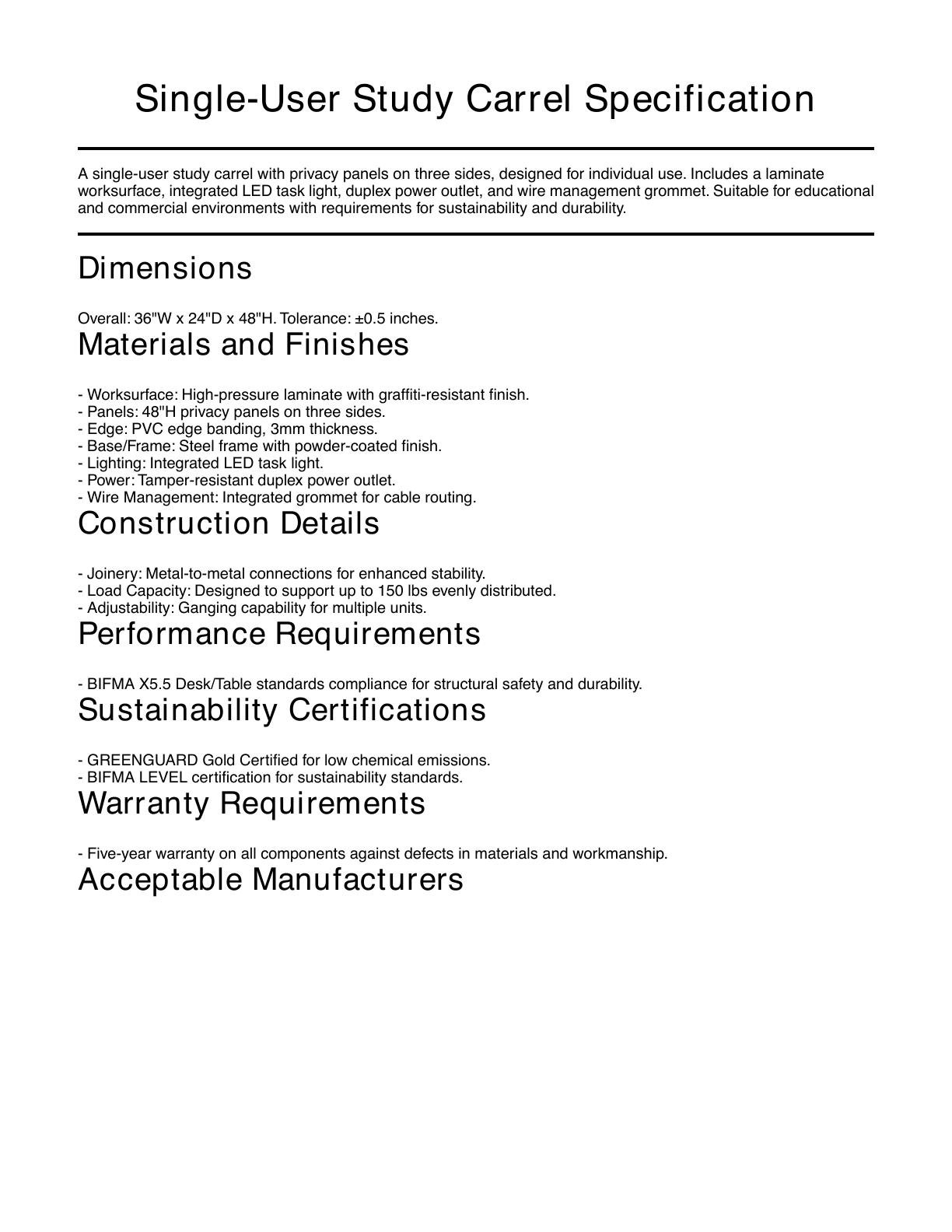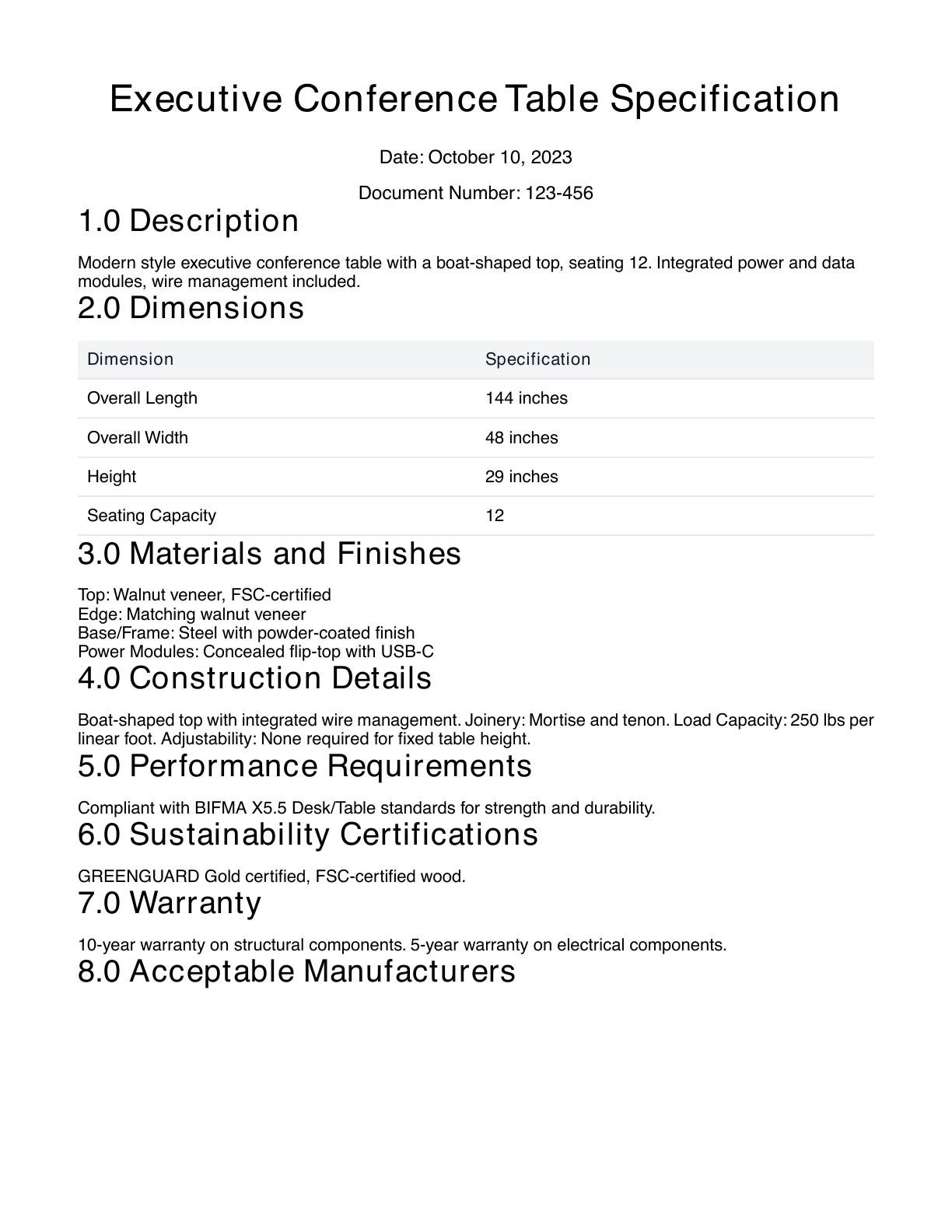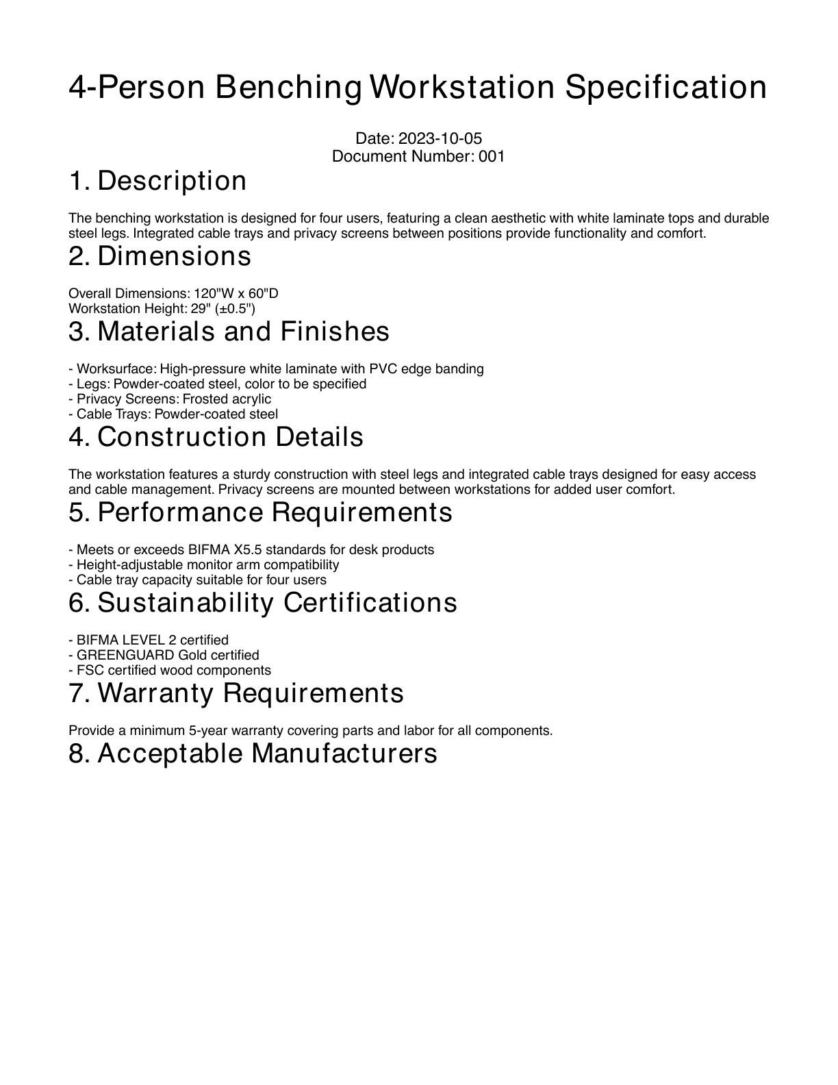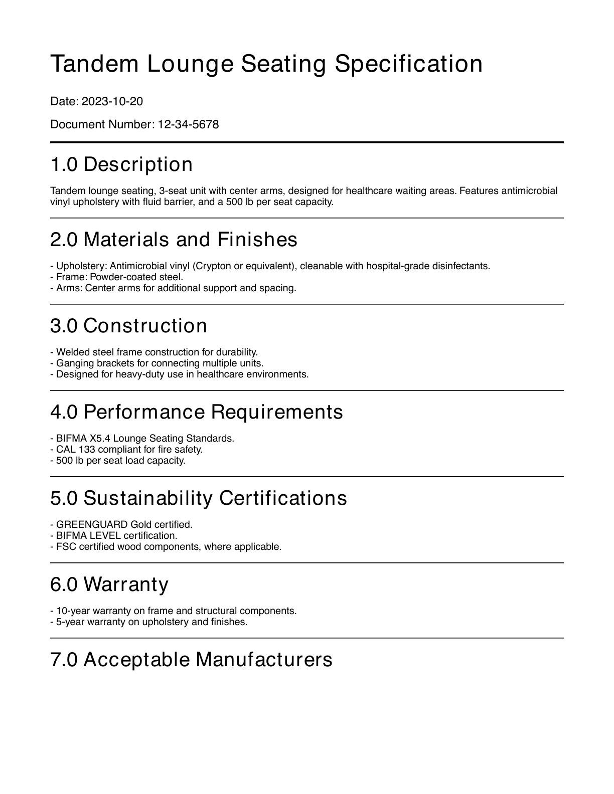 صف قطعة أثاث واحصل على وثيقة مواصفات احترافية تشمل الأبعاد والمواد وتفاصيل البناء ومتطلبات الأداء وشهادات الاستدامة والمصنعين المقبولين. منسقة للإدراج في أقسام مواصفات القسم 12.