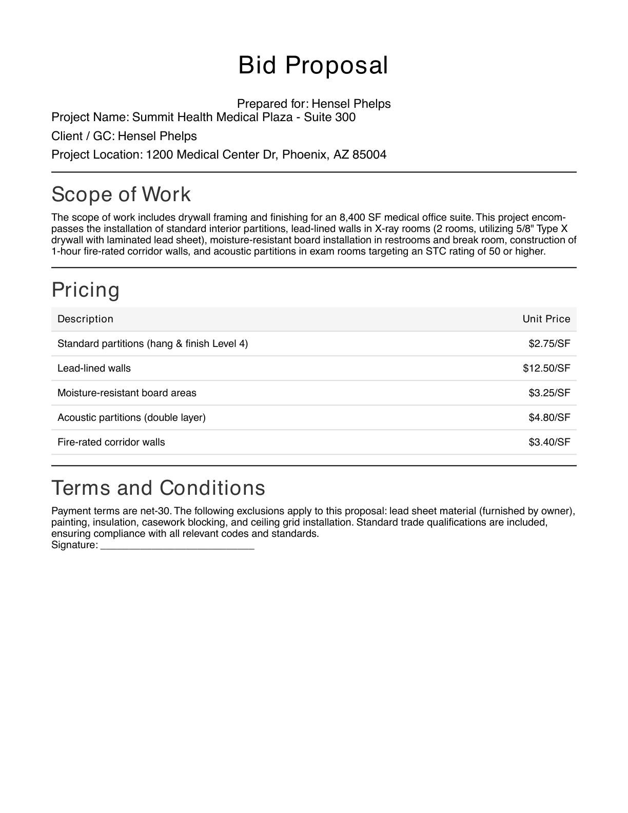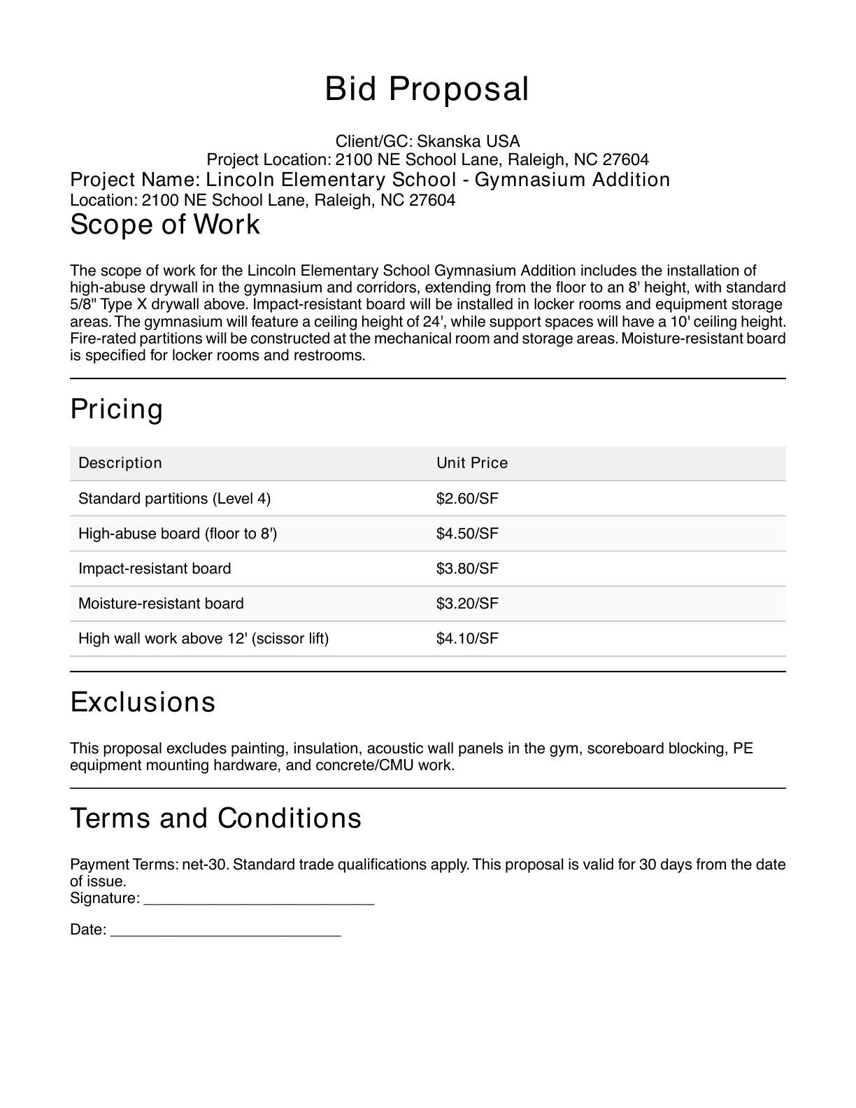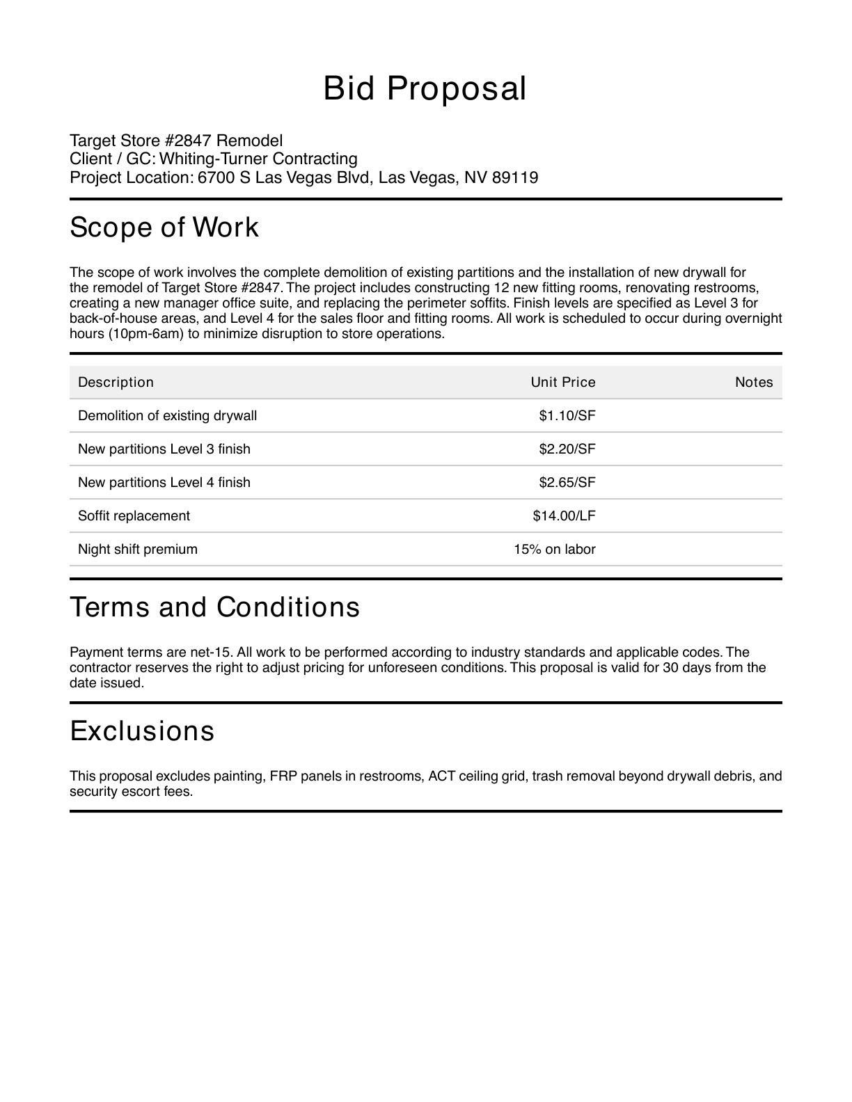 Create polished, ready-to-send drywall bid proposals with detailed scope of work, pricing tables, exclusions, and terms. Saves hours of writing and ensures you never miss critical contract language.