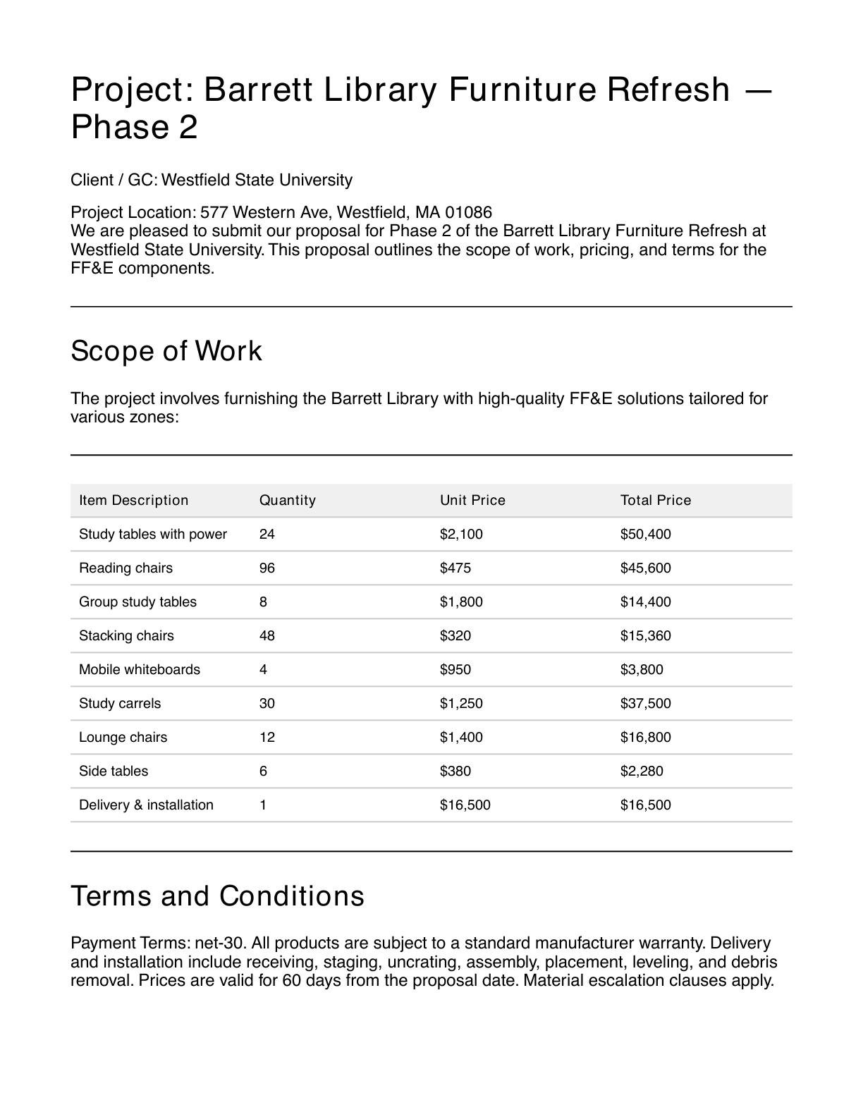 Create polished, ready-to-send FF&E bid proposals with detailed product specifications, pricing by category, delivery and installation terms, and warranty information. Saves hours of writing and ensures your proposals reflect the professionalism clients expect from a furniture dealer.