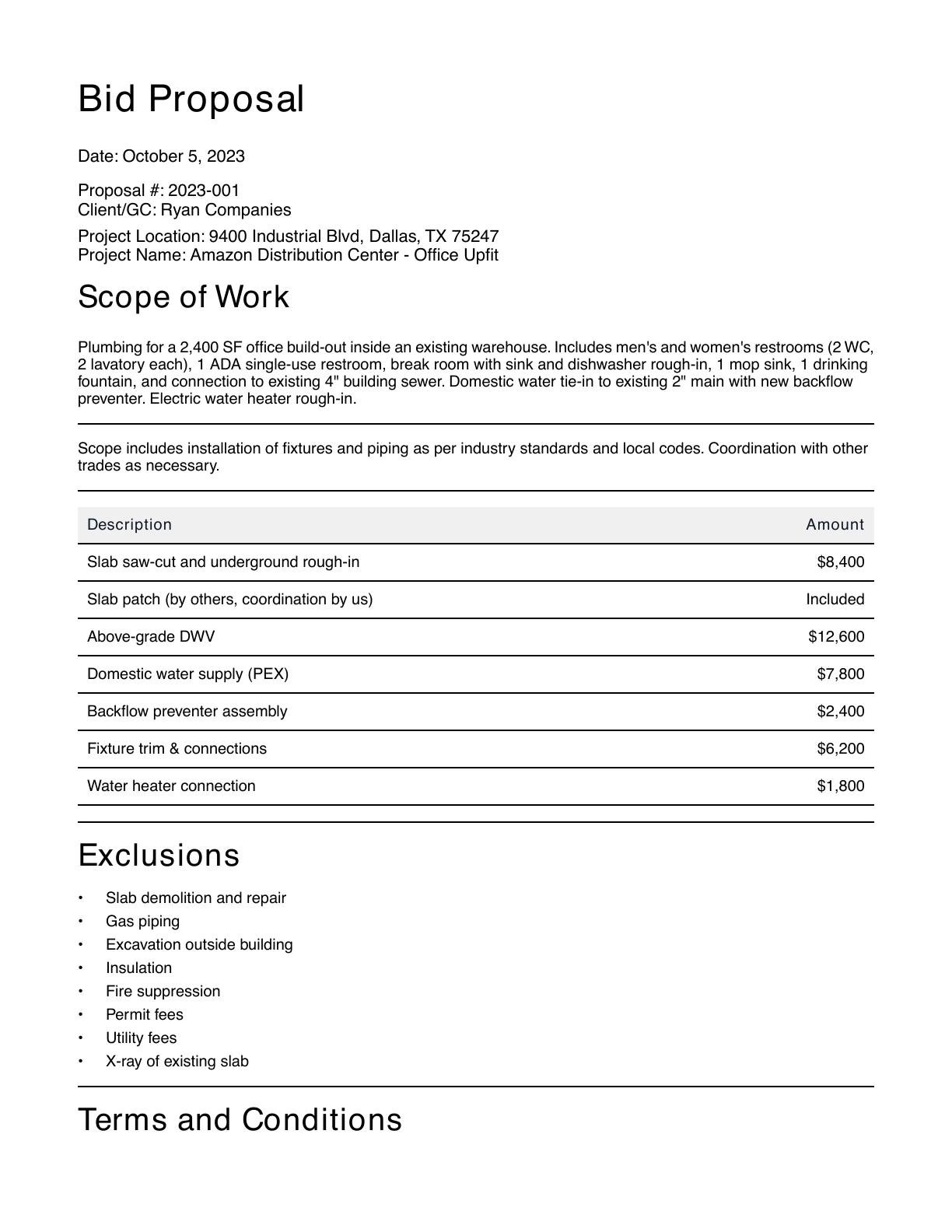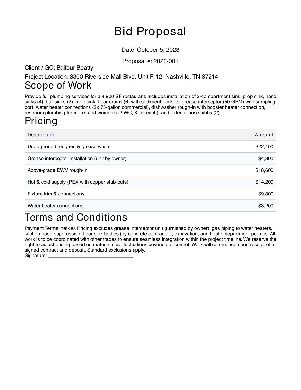 Create polished, ready-to-send plumbing bid proposals with detailed scope of work, pricing tables, exclusions, and terms. Built for plumbing contractors who want to spend less time writing proposals and more time winning work.